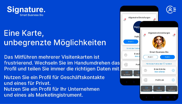 Zwei Profile – z. B. geschäftlich & privat; live aktualisierbar, als Homescreen-Icon speicherbar.